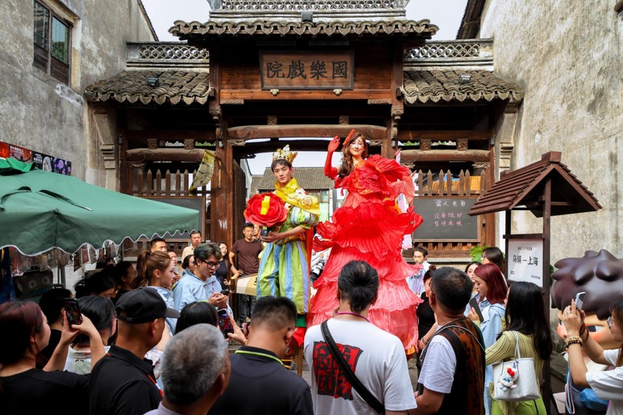 乌镇戏剧节的魅力从不局限于传统剧场。从开幕当天上午开始,西栅的石板路、石桥、水阁和街巷就变成了开放的“露天剧场”。古镇嘉年华单元集结了89个中外表演团队,呈现超过2000场演出,将戏剧“种”在了水乡的每个角落。
